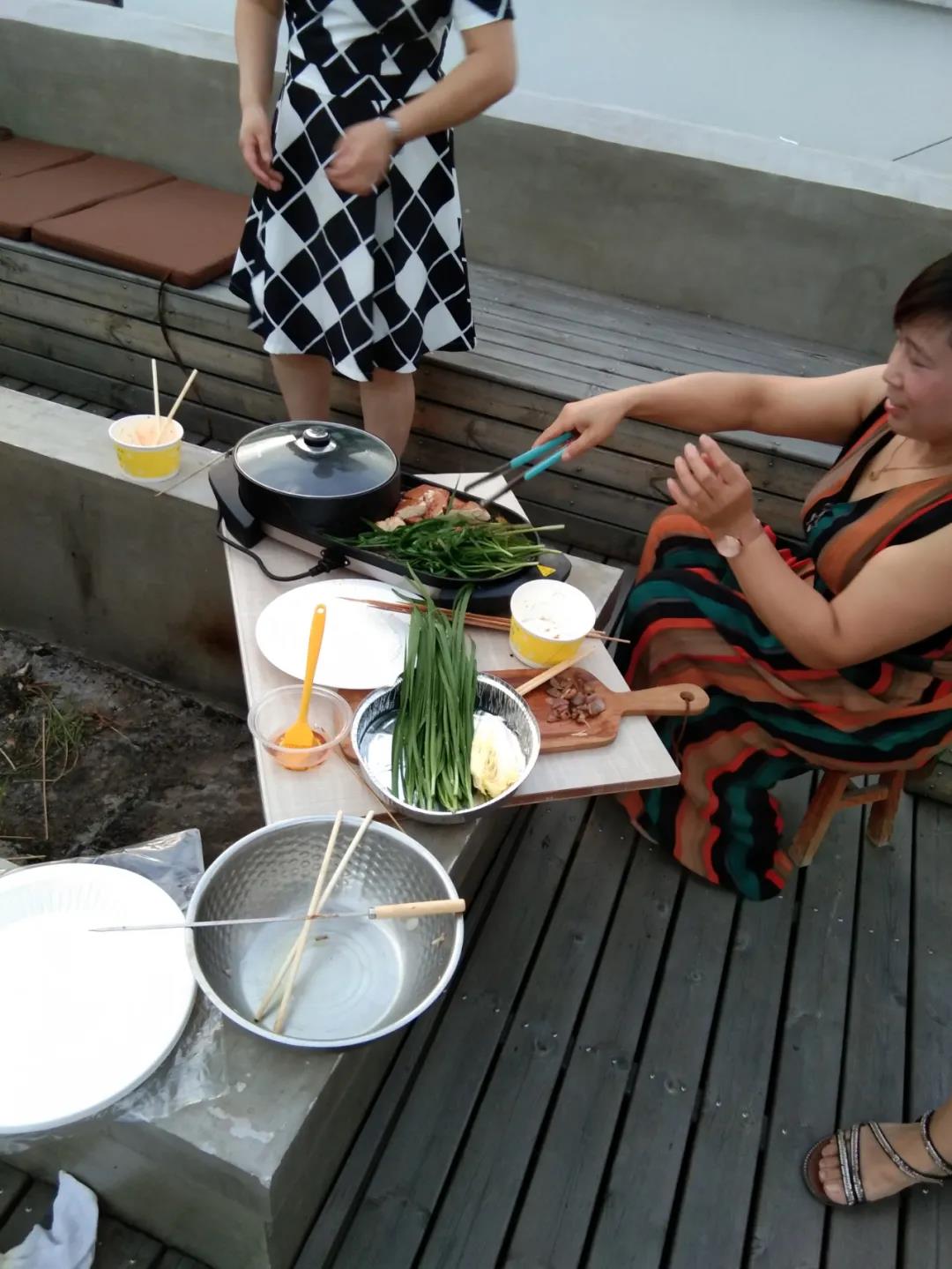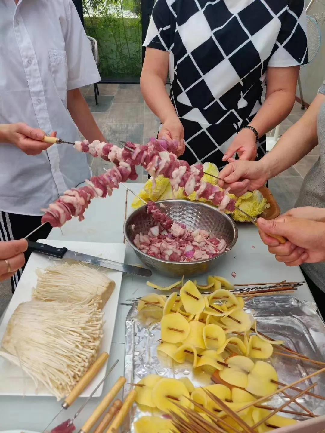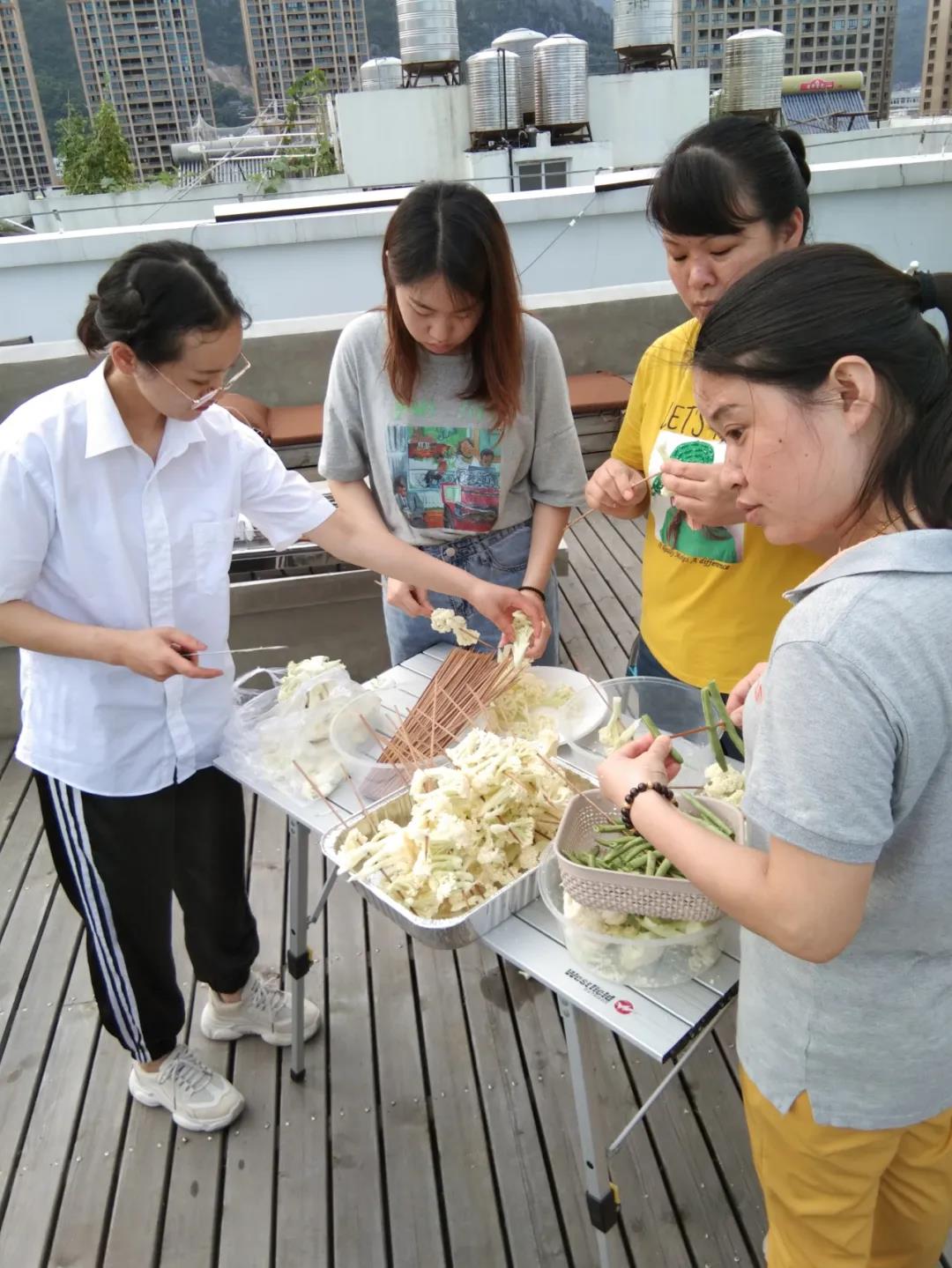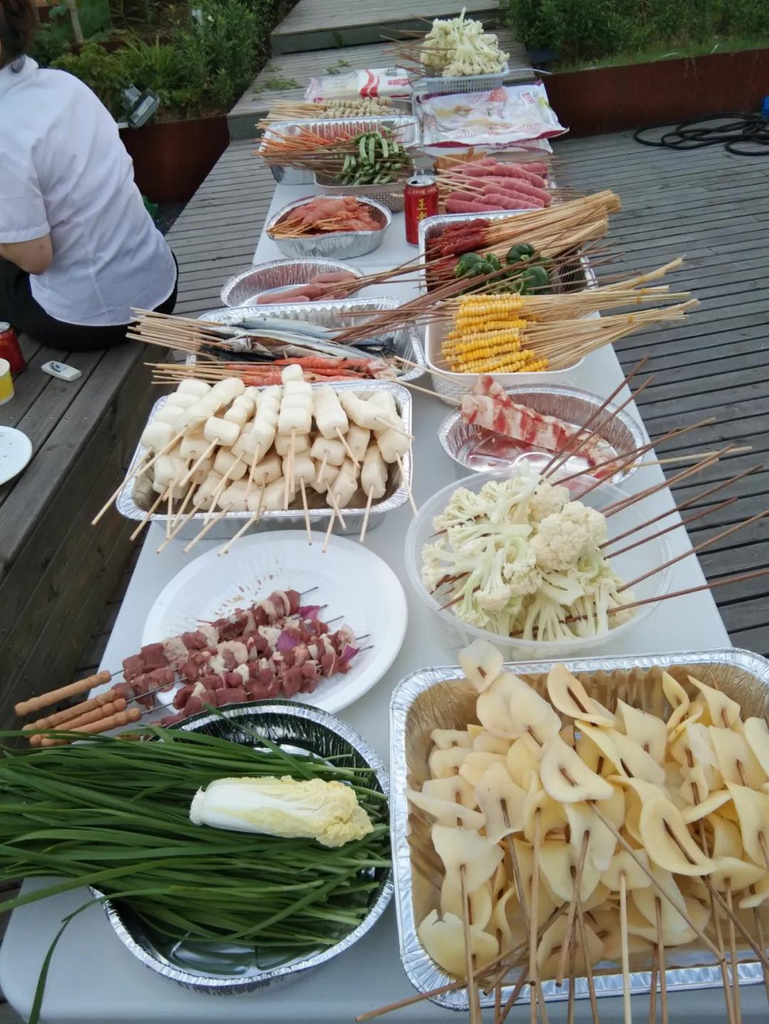 大家在積極忙碌著,擺盤、摘菜、串串,準備了整整兩大桌菜。